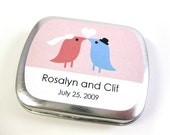 Personalized Wedding Mint Tin Favors | Beau-coup Charming pocket-sized tins are available in your choice of color and are personalized for you with your choice of a custom printed label in your choice of Beau-Coup exclusive designs with your special text added. The mints included in these cute favors are shiny with slightly chewy centers with mild peppermint flavor - your guests will love them!